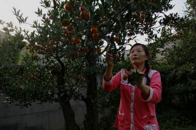 9月7日,竹山县晓春花木盆景园技术员在查看挂果的金弹子长势。据晓春花木盆景园经理黄治虎介绍,他从1999年春季开始,在该县楼台乡三台村租赁20余亩土地,在外地购买、收购野生名贵树桩、树蔸、树根等资源,采取“高低搭配,大小混栽,错落定植”的栽培模式,经过一段时间的精心养护成活后,春季要注意请沟排水,夏季高温多热,干燥,要搭遮阳棚,用喷水壶喷水降温增加空气湿度,保持树桩表面湿润光泽,逐步增加散射光照。冬季采取保温防寒措施,用埋土法将树桩栽入沙土堆里,上面用塑料纸盖上。16年来,经过他的园艺团队精心培育和造型,培育出金弹子、中华蚊母、紫薇、白蜡、桂花等珍贵盆景4000余盆,这些形态各异、生意盎然的树桩盆景既靓化了周边的生态环境,又为自己增加了财富。(视界网程平 摄影)