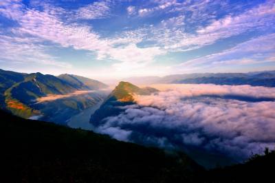 太阳完全出来了,天空由灰白变得碧蓝。放眼看去,峡江两岸上空奔腾的云海仍在演绎着气势磅礴的画卷,逶迤无边的群山尽收眼底。此时,我生怕漏掉一处美景,不停按动着相机快门,不停改变着光圈,将这绝佳风景记录下来。