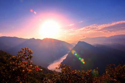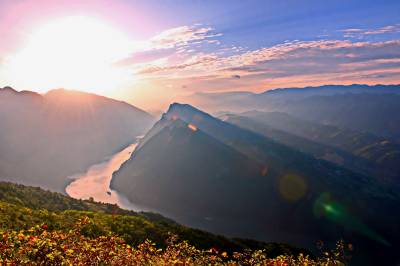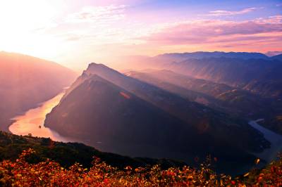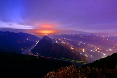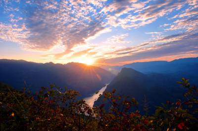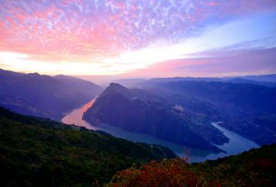 清晨5时30分,晨曦微露,长江巫峡口两岸,如雪的云彩将山城覆盖。第一缕阳光从山头斜射下来使云彩时而金黄、时而泛红,跌宕起伏的山岚凸显。随着阳光的照射气温逐渐上升,云海也慢慢飘移,长江在云海里若隐若现,云线或浓或淡,轻轻的游走在群山间,感觉就像在脚底下流动,让人仿佛置身仙境一般。