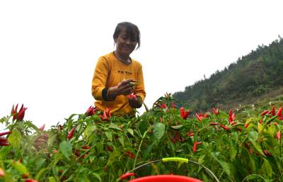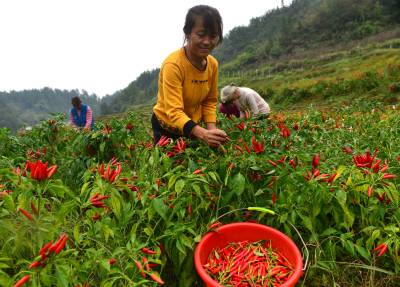 10月9日,建始县业州镇猫儿坪村菜农正忙着采摘上市的朝天椒。今年,该县业州、红岩寺、花坪三个乡镇走产业扶贫新路子,为这些乡镇部分贫困村订单种植朝天椒,贫困户亩销售收入达4000元以上,加快脱贫致富步伐。本报视界网刘波摄 建始县新闻中心刘波联系电话13032794298