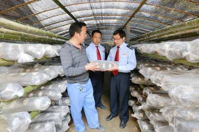 10月10日,竹山县国家税务局精准扶贫工作队队员深入双台乡南口村二组毕公贵(左)种植的食用菌基地里,了解食用菌长势等情况。该局把精准扶贫与发展产业紧密结合,在南口、花园、青山3个扶贫村谋划出一批致富快的养殖、种植等好项目,并协调解决资金、技术培训、土地规划和产品销售等后顾之忧,变“输血”为“造血”,促致富,早脱贫。