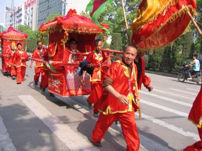 《喜庆低碳环保大花轿》2010年5月3日,云梦街头一对大花轿迎娶新人,格外引人注目。