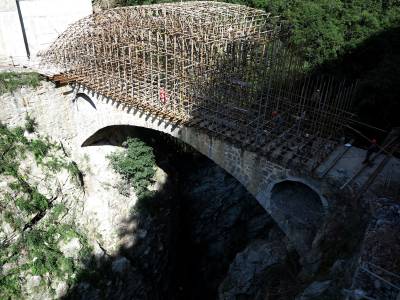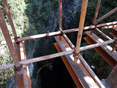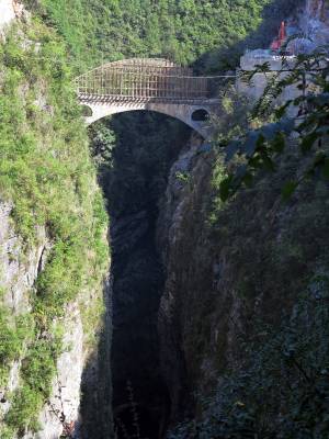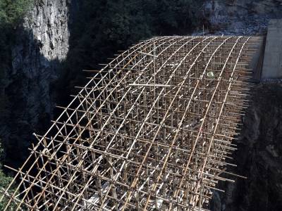 湖北省鹤峰县屏山峡谷已经是远近闻名的自然旅游景点,由于基础设施条件极差,峡谷上唯一的石拱桥已成为危桥,公路弯急路窄。县政府为加快基础设施建设,投入大量资金修建桥梁,扩宽公路,目前正在紧张施工,预计明年五月可完工投入使用(通讯员王群摄影报道)。