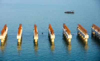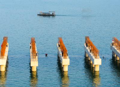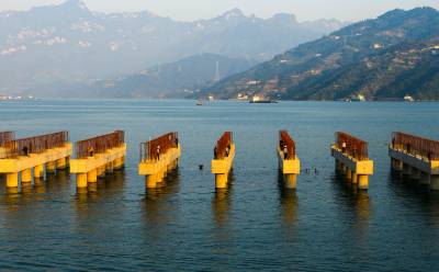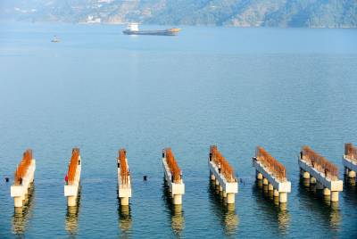 工人施工的身影,如同琴键上演奏的音符。 秭归港是紧邻三峡大坝的一个货运枢纽港。目前,作业区正处于三峡新一轮175米试验性蓄水期,施工人员抓紧施工,与蓄水赛跑,只争朝夕,力争早日完成港口建设。