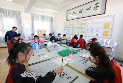 10月14日,竹山县麻家渡镇九年一贯制学校的小学生正在上毛笔书法课。为全面推动落实“书法教育进课堂”,继承与弘扬中华民族优秀传统文化,该县在中小学义务教育语文课程中,按照课程标准开展书法教育,三至六年级的语文课程中,每周安排一课时的书法课。同时结合学科特点开展形式多样的书法教育,并通过有序开展书法讲座、比赛、作品展览、兴趣小组等系列活动,提高学生写字兴趣,培养学生的汉字书写能力。