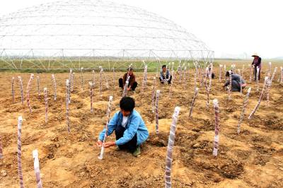 图一:技术人员在房县军店镇何家村为荆棘滕穿“保暖衣”,待来年嫁接牡丹花