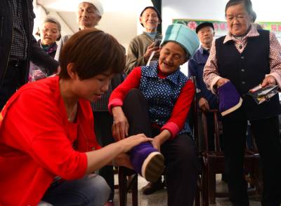 10月20日,建始县爱心企业协会11家老板带着员工来到红岩寺镇福利院,帮福利院老人试穿购买的新棉鞋和袜子,义务为每位老人修指甲等。一双棉鞋 几多温情,送爱心、敬孝心,点滴爱心温暖五保老人心。个个五保老人乐开怀。本报视界网刘波摄 建始县新闻中心刘波联系电话13032794298
