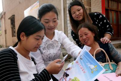 10月21日,湖北省武穴市田镇办事处兰州社区9组女青年孙玉用手机从办事处副主任段丽芬(左二)手中的宣传单中扫下办事处计生办微信二维码,方便今后与计生办取得联系。为了更好解决现在育龄妇女流动性大,相关动态难于及时掌握的问题,湖北省武穴市计生系统利用现代交流手段,及时与计生对象交流,传递相关政策信息,受到育龄妇女的普遍欢迎!据不完全统计,全市卫计系统微信平台联系对象已达到13.41万人。视界网冯怡红摄