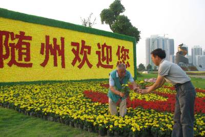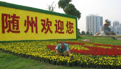 百万盆鲜花扮靓寻根节6月3日,随州市政府山绿地,园林工人将近万盆鲜花摆成”随州欢迎您”和寻根节节徽图案。据悉,寻根节期间,全市将用100万盆(株)鲜花扮靓随城。(本报视界网杨文明摄)