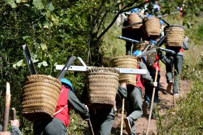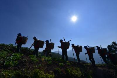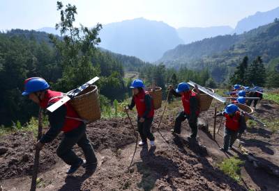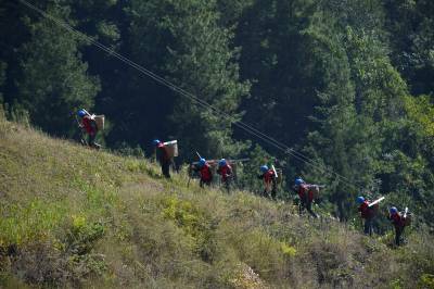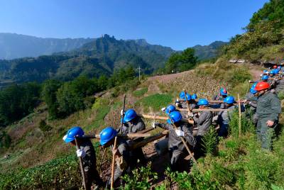 10月22日,国网利川市供电公司员工用“蚂蚁搬家”的方式,用背篓、绳索等工具,向山梁上运送、安装山区供电设施。