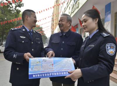 “凡是自称公检法要求汇款、汇款到安全帐户、中奖领补贴要先交钱、家属出事要汇款、电话索要个人和银行卡信息、开通网银接受检查、自称领导要求汇款、陌生链接要登记银行卡信息,有这十种情况之一的,坚持不轻信、不透露、不转账,电话诈骗就骗不了”,10月23日,湖北宜城公安局鄢城派出所民警穿社区、走巷道,对退休职工、空巢老人上门普及防范虚假信息诈骗知识。图为民警为退休职工老李支招,“十个凡是、三个不”可防虚假信息诈骗。 湖北宜城公安局 徐桂红