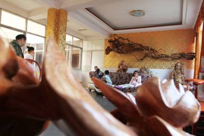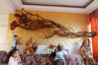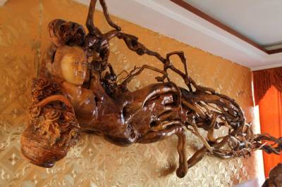 10月25日,房县城关镇北关社区居民周泽勋家的一位4.5米高的“美女”,引来街坊邻居前来仰慕观看。这位“美女”是天然黄娘木树根的化身。周泽勋将天然黄娘木树根经过简单雕刻、修饰,变成活灵活现的“天女散花”,悬挂在自家宽敞明亮的客厅。据周泽勋说,黄娘木树根雕“美女”形象毕真,极具观赏性,身高天下独一无二,悬挂在客厅墙壁上也十分罕见,根雕“美女”身价达10万余元。