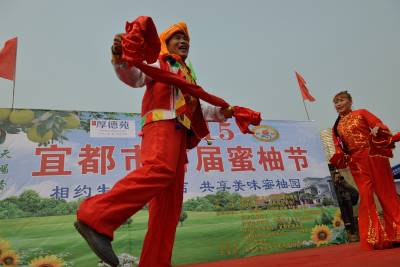 文化搭台 蜜柚唱戏 10月24日,宜都市首届蜜柚节在宜都市枝城镇何阳店村举行。丰富多彩的文艺节目吸引5000多游人前来赏节目摘蜜柚。 何阳店村有蜜柚柑桔万余亩,其“洋溪蜜柚”因“皮薄肉厚味甜水份多”而远近闻名,产品远销欧洲及中国华北东北等地。