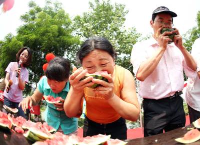6月4日,荆门市掇刀区掇刀石街道办事处双井村村民以举行吃西瓜大赛的形式,来表达对西瓜丰收的喜悦心情。今年,该村采用”合作社+基地+农户”的产业化经营模式发展无公害大棚礼品西瓜,成为荆门市”精品西瓜第一村”。目前,在该村的带动下,掇刀区共种植西瓜2000亩,200多户村民靠西瓜走上了致富之路。本报视界网赵平摄