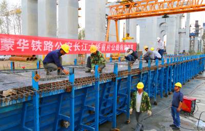 工人们精心施工,克服截面面积小,操作空间狭窄等施工困难,确保了公铁合建段首片公路箱梁混凝土的浇筑,预计2016年完成箱梁预制和架设任务。