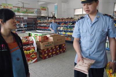 6月3日上午9点30左右,云梦县工商局执法人员在当地一校园小卖部内发现一块非行业评选机构颁发的”放心超市”牌匾。检查中,执法人员发现该”放心超市”货架上标注的仙桃市佳佳面包房生产的面包和蛋糕生产日期均为6月3日,产地均为仙桃市龙华山办事处大字号村五组,按时间推算,这么短时间内,这些面包难以制作并包装完好运送到到此,执法人员要其查看进货台账,经销商提供不了。工商部门当即责令其限期整改,目前,此事正在进一步调查处理之中。(本报视界网王云清摄)