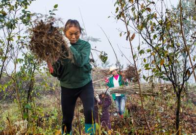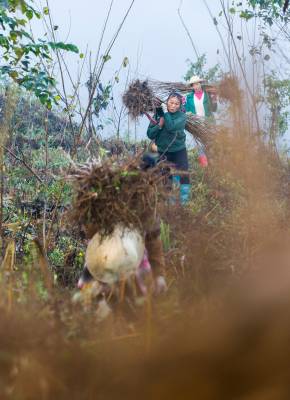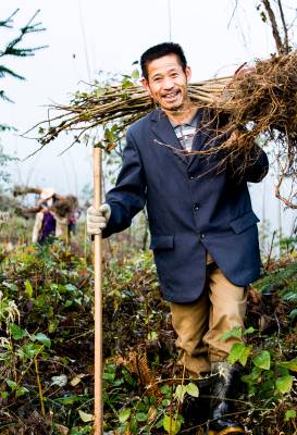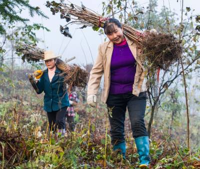 10月中旬以来,竹溪县积极组织全县留守村民以乡镇为单位,以村为片抢抓秋冬交接时节大力植树造林护林,计划全县今年秋冬新植、补植各类树苗50万株,完善植树造林,绿化裸土,固土洁水,优化绿色环保自然环境,2015年11月1日清早,竹溪县龙王垭茶场村民正在向植树地运送树苗(视界网温大树摄)。