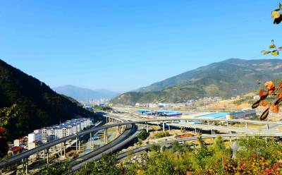 这是11月2日拍摄的保康县城关镇牌坊湾美丽如画的高速公路互通路段,麻竹和保宜高速在此交会。