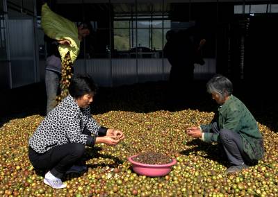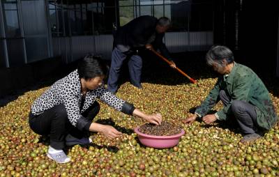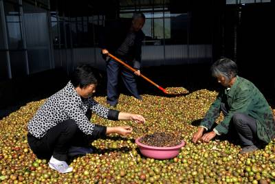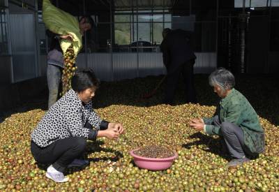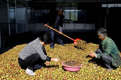 11月2日,竹山县荣华油茶专业合作社负责人谭绍荣组织劳力晾晒油茶鲜果。据了解,竹山县城关镇女青年谭绍荣从2013年秋季开始放弃经商行业,来到该县溢水镇花栎村王家坪流转1700亩油茶林,聘请当地村民锄草疏林、修剪树冠、培土施肥,实施改造管护;去年她注资1000万元组建了荣华油茶专业合作社,同时她还兴建340平方米的加工厂房,铺设引水管网,修通入园劳作机耕路。她通过两年多时间的经营管理,今年茶果挂满枝头,预计收10万多斤油茶果,产值超过10万元。(视界网程平摄影)