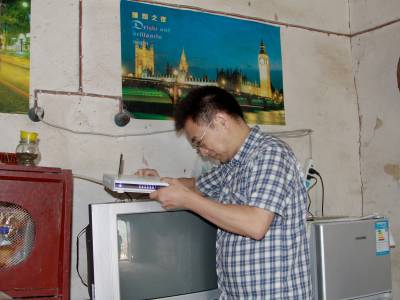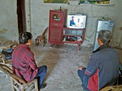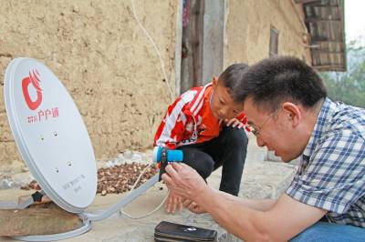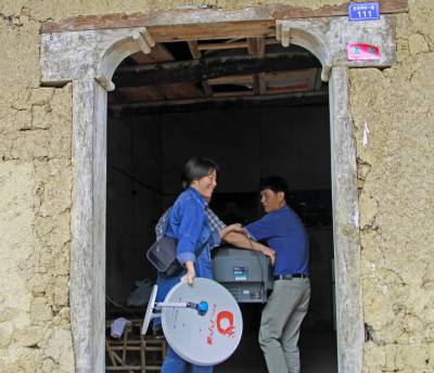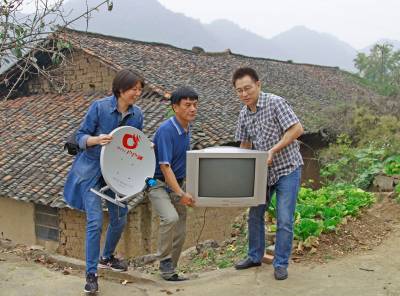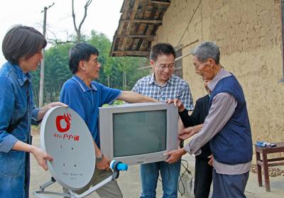 > 城里的好心人给程老汉送来卫星天线和电视机