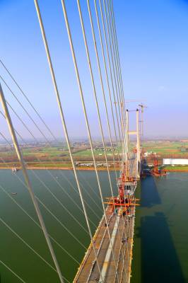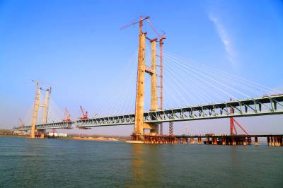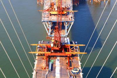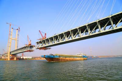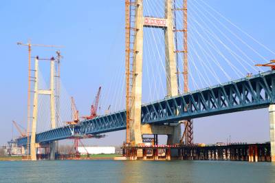 本报荆州讯(通讯员 孟庆虎) 11月6日,由中铁大桥局承建的蒙西华中铁路公安长江大桥主跨斜拉桥钢桁梁架设累计完成68个节间,占总数比例88.3%,斜拉索挂设累计完成112根,占总数比例82.4%。 蒙华铁路公安长江大桥为主跨518米的双塔钢桁梁斜拉桥,是国内首条跨越长江的重载铁路桥梁。斜拉桥钢梁共77个节间,总重3.2万吨。大桥主跨将于11月下旬合龙,年内实现主桥贯通。