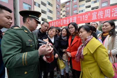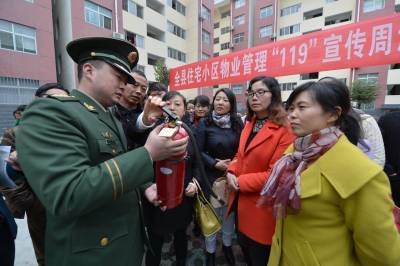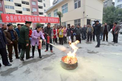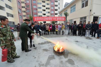 当日,在11月9日第25个“全国消防日”来临之际,保康县房管、公安、消防等部门联合在该县河西祥和三小区举办全县住宅小区物业管理“119”宣传周活动,来自该县16家物业管理公司的近百名员工参加了定点灭火、楼宇火情疏散、人员救护等项目的演练。活动旨在检验物业公司员工的突发事故应急处理能力和救援能力,提升居民的安全消防意识和逃生技能。 11月9日是第25个全国消防日,今年的主题是“参与社区消防,建设平安家园”。 (视界网 杨韬 欧阳智慧 摄)