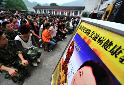 5日,宣恩县疾控中心医生利用周末在该县中等职业教育学校开展防治艾滋病常识宣传。山区原本是艾滋病”净土”,一直以来民众”防艾”意识意识也因此显得十分淡薄,对其基本常识缺乏了解。随着经济社会发展,山区人群结构日趋复杂,当地医疗、学校等加强了对”防艾”知识宣传力度,在民众中树立”防艾”意识。(视界网签约摄影师:宋文摄)