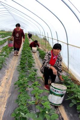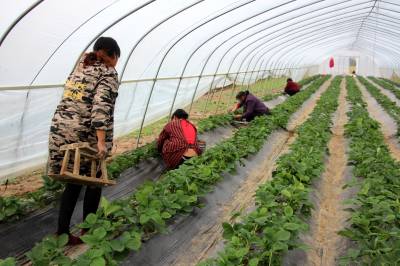 2015年11月11日,已经进入冬日,数名农村留守妇女在云梦县义堂镇黄土坡村魏树生家庭农场参与摘除草莓老叶等管理。近年来,云梦县一批家庭农村应运而生,吸引大量劳力在家门口打工。家庭农村的兴起,农村劳力家庭农场就业,既缓解了家庭农场缺劳的后顾之忧,又拓宽了农民就业渠道,让众多农村劳力在家门口就业增收,一举多得,受到农场主和农村劳力的欢迎。视界网 陈保忠 摄