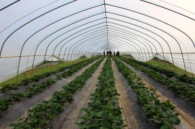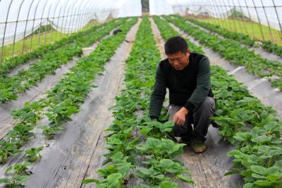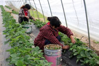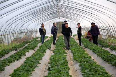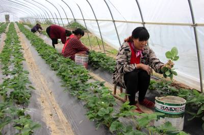 2015年11月11日,云梦县义堂镇黄土坡村魏树生家庭农场组织劳力对大棚草莓苗进行摘除老叶等管理。魏树生早年在东北、陕西等地打拼多年,积累一定资金后,毅然回归家乡办起家庭农场。目前,魏树生家庭农场的大棚草莓长势良好,草莓已经开始开花结果。预计到十二月份草莓即可上市销售。魏树生家庭农场规划建成绿色生态观光垂钓采摘园,届时城乡居民在家门口就可采摘到新鲜的草莓等时令生态鲜果的等放心农产品。视界网 陈保忠 摄