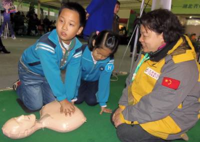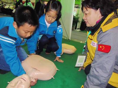 武汉市江汉区滑坡路小学四年级(6)班学生王天逸(右),11月7日,在武汉国际会展中心参加该校组织的爰心公益活动后,参加了该市阳光生命公益救援中心在现场的义务救护培训,他在现场自愿者老师的培训下,一很快熟练的掌握应用了现场救护知识,得到了现场老师的好评。同时,留下了他的联系方式,留他加入阳光生命公益救援自愿者,利用业余时间,走进我市小学校园,教小学生们学习辅导救护知识。