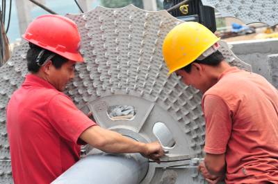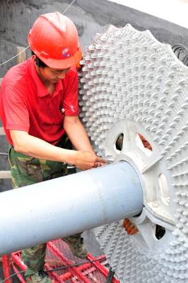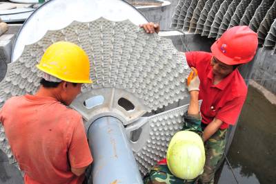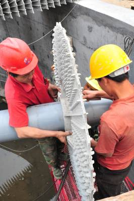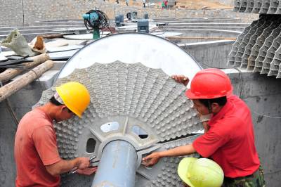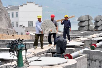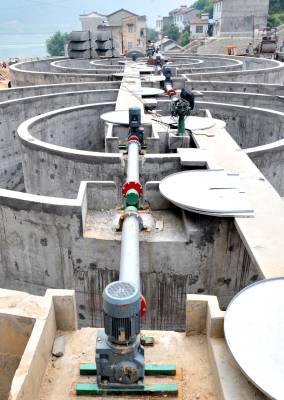 2010年6月5日是世界环境日,在位于三峡工程坝区的湖北省宜昌市夷陵区三斗坪镇污水处理厂建设施工现场,工人加班加点安装污水处理设备,以确保该厂按期投入使用。 三斗坪污水处理厂是国家第三批三峡坝库区水污染防治项目,于2009年4月开工建设,总投资3785万元,设计日处理污水2500吨,目前主体工程建设完成,进入设备安装阶段。该项目预计今年底投入使用后,三峡坝库区的生态环境将得到进一步改善。本报视界网张国荣摄