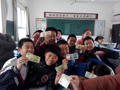 2015年11月18日上午,湖北省十堰市郧阳区白浪镇九年一贯制学校刚刚举行期中考试后的第三天,该校2014年新上岗的90后省编农村义务教育学校乡村女教师李艳丽在看到学校教务处下发的成绩单后,直接发钞票奖励学生,促其学习进步。(颜克存 摄)