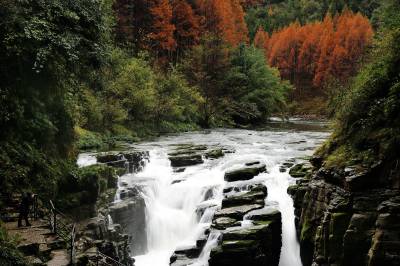入冬,利川市腾龙洞的景色分外迷人,清澈的清江河边火红的水杉树林。壮美的瀑布,未见其洞、先闻其声、清江流入腾龙洞水洞入口处,浩浩荡荡的江水垂直扑下,浪沫翻滚、碎玉喷雾、声震九渊,几可媲美黄河壶口瀑布。