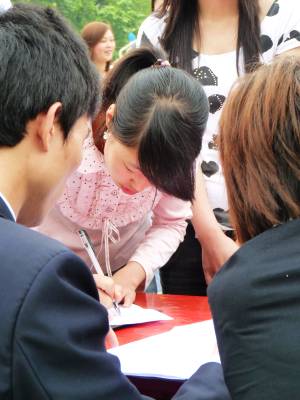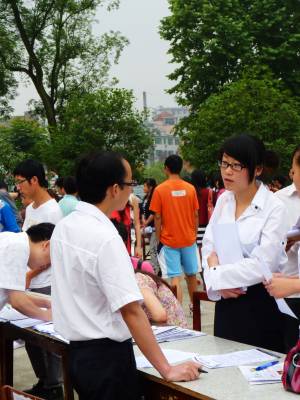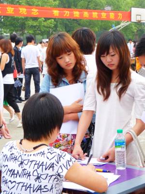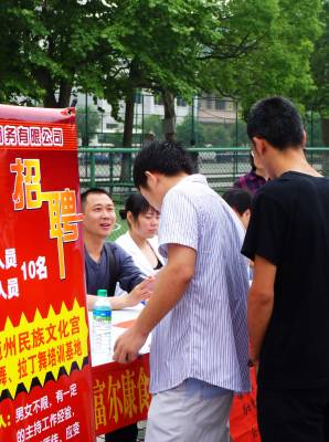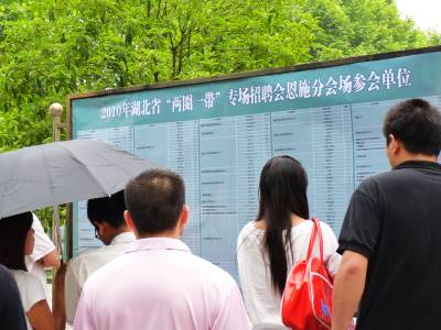 为进一步促进湖北省高校大学毕业生就业,加快推进”两圈一带”新一轮开发开放提供人才和智力支持,6月6日上午,由湖北省政府主办的”两圈一带”大学生就业大型专场招聘会在武汉、黄石、咸宁、襄樊、恩施、宜昌和荆州7城市同时举办。整场招聘会提供1—2万个招聘岗位,其中约八成岗位面向应届高校毕业生,不需就业经验。图为恩施分会场