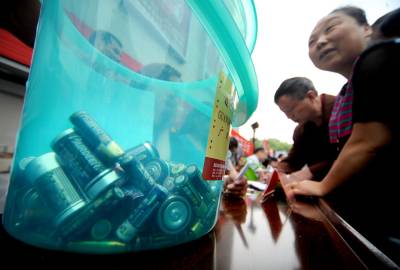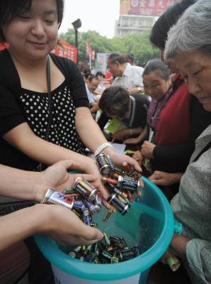 6月5日上午,宜昌市西陵区环保局、科技局、司法局、卫生局、各街办、乡、开发区的工作人员走上街头,向过往市民进行环保知识宣传,同时开展”2节废电池兑1个环保袋”和”我为环保献1计兑1个环保袋”活动,现场回收废旧电池大量废旧电池。记者刘曙松摄