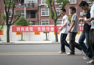 考场标语”温馨”转身”拥抱诚信,告别作弊”、”自信是你成功的基石,沉着是飞翔的翅膀”……6月6日,记者在孝感车站中学考点看见,昔日严肃的考场纪律警示语”温情”转身,人性化的标语既帮助考生减压,也让考场变得温馨。签约摄影师晏美华摄