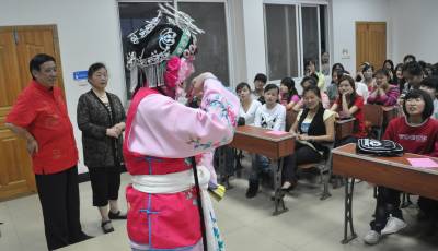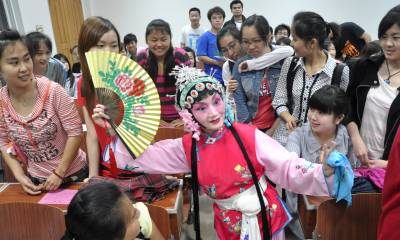 6月6日,一位票友在湖北民族学院艺术学院教室里演唱传统京剧《卖水》选段。当日,恩施星光剧与湖北民族学院联合主办”高雅艺术进校园”活动,来自恩施、利川、宜昌以及重庆万州等地的60余名京剧票友携优秀剧目走进大学校园,为学生们展示民族艺术的魅力。