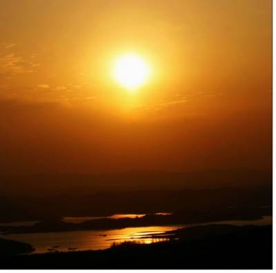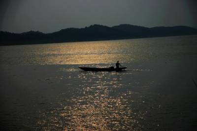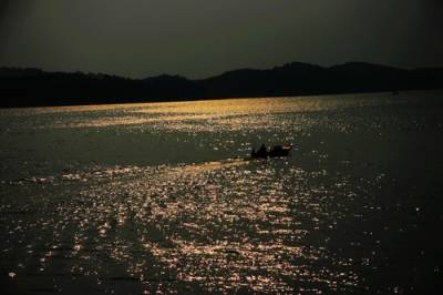 摄于丹江口水库,傍晚的落日映红了天空,太阳的余辉在江面上泛五彩的金光.