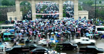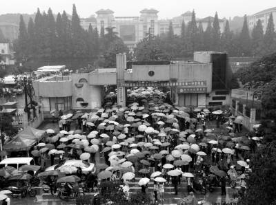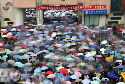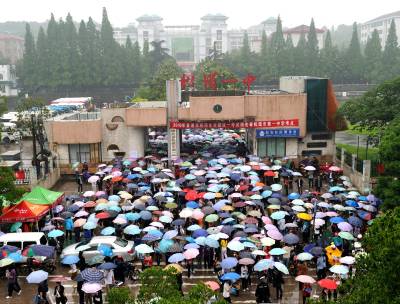 今年高考又遇到阴雨天,上午语文考试结束时,接考生的家长和出考场的学生在校门汇集形成了雨伞的海洋!
