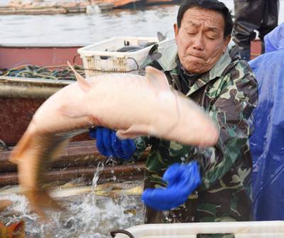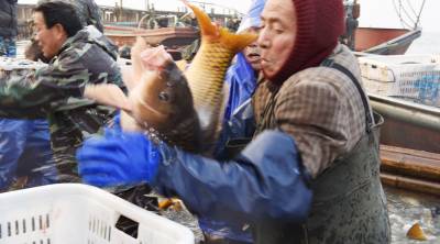 从 12月1日起,湖北省黄冈市武穴城东的武山湖国家湿地公园生态活鱼源源不断地装上专运车,运往江浙和武汉等地。据介绍,原武黄湖渔场2011年12月经国家林业局批准成立国家湿地公园后,放养由效益型向生态养殖转变,品质提高了,销路更俏了,给沿湖村带来鱼苗销售、渔工捕捞、运输、销售等收入480万元左右。图为12月25日,摄影师拍摄的渔工捕捞生态活鱼的镜头。视界网冯怡红摄