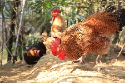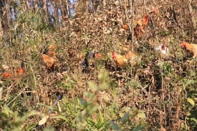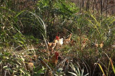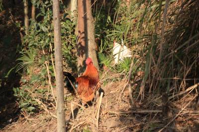 林下养鸡助精准扶贫 12月27日,身强力壮的林下土鸡在林间觅食。据了解,这是竹溪县水坪镇东沟村大学生村官、村文书翟照龙利用自购的小鸡孵化机今春孵化养殖在老家驻地山林间近200只土鸡。据瞿照龙的父亲翟远树介绍,小鸡自己孵化由于无细菌传播成活率几乎是百分之百,今年实验性养殖,明年将扩大养殖规模。翟照龙通过迁移扶贫在水坪镇集镇购买了新房,返乡到老家创业,这一从实际出发,发展林下养殖为精准扶贫提供了模式。(视界网 王忠春 摄)