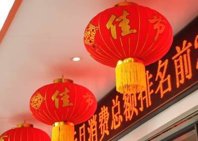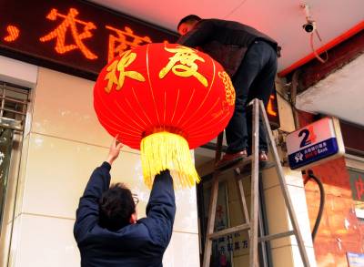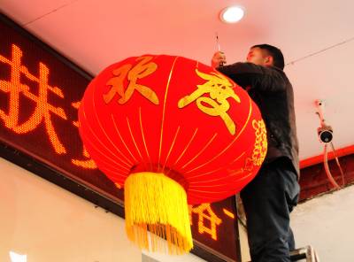 12月28日,十堰市郧阳区农商行解放路营业所门前,几名工作人员正在悬挂大红灯笼。2015年即将过去,人们张灯结彩高挂传统文化的大红灯笼迎接2016年,以大红为大吉,以祥和平安的良好祝福迎接新的一年。 视界网周家山 摄
