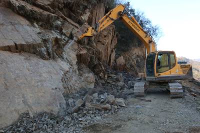 12月28日,房县红塔镇潮汪村修路工地上工程机械正在开山破石。该村5组地处大山深处,常年不通公路,村民出行要绕道山路,运送化肥等物资靠肩挑背扛,生活很艰难。为改变村里贫穷落后的面貌,该镇整合精准扶贫资金,修通出村公路。视界网 杜达巍 摄