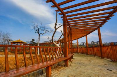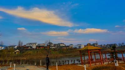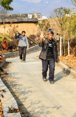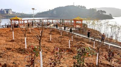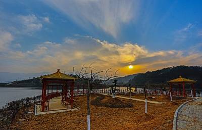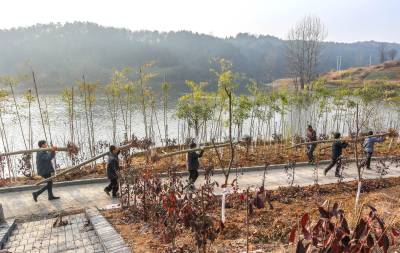 2015年12月29日,竹溪县龙坝镇的村民抢抓冬闲时节给在地国家级“龙湖湿地公园”植树添绿,龙坝镇今冬为龙湖公园添植各类常观赏风景树35000余株,力争把该国家级龙湖湿地公园建成让来自四面八方的游客赏心悦目、流连忘返的湿地公园。湿地公园内才建成弯月雏形的便于游客游乐歇息的木质观景亭也在夕阳照射下闪烁金色之光。29日,竹溪县龙坝镇村民在向龙湖湿地公园运送正在栽植的垂柳等风景树(视界网温大树摄)。