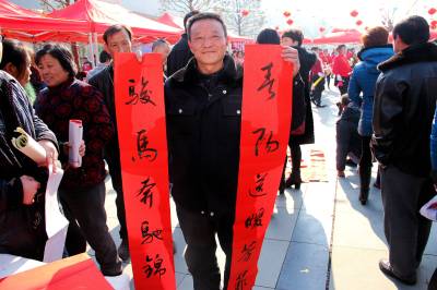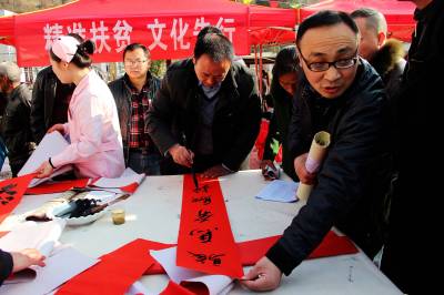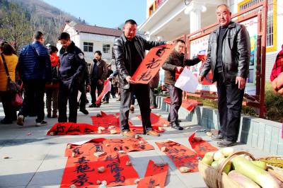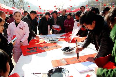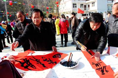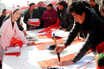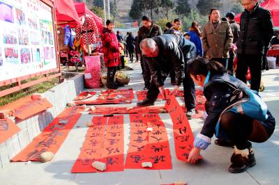 2016年1月2日,来自房县的书法家在房县窑淮镇三岔村现场挥毫泼墨,免费为当地农民写春联,送祝福,共迎新年。一副副充满吉祥祝福的春联受到农民朋友的热捧。