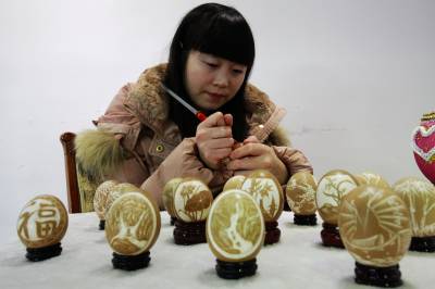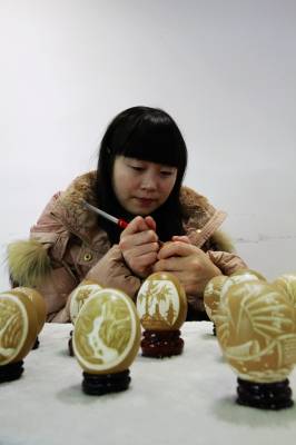 蛋壳上的艺术 1月5日,女青年熊书菊和她的蛋雕作品。家住宜昌伍家岗区的熊书菊2013年开始钻研蛋雕艺术,经过不断的尝试,自己的雕刻技术越来越纯熟。她利用多种刀法进行浅浮雕、镂空雕,把山水、花鸟、人物还有三峡风光等具有浓厚的乡土气息的作品凝固在薄薄的蛋壳上。精致的蛋雕作品受到人们的喜爱。 本报视界网黄翔 摄