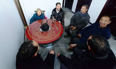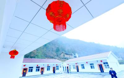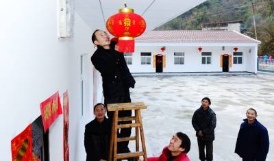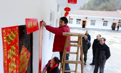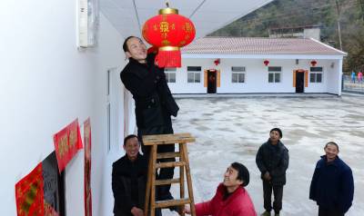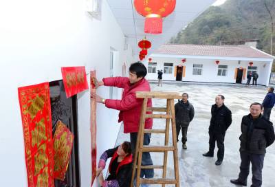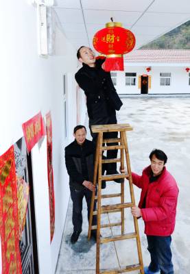 2016年1月7日,村民在保康县城关镇三道峡村幸福苑公产安置小区分配的新房前挂灯笼、贴对联。