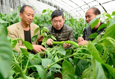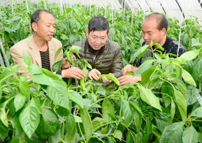 1月10日,在保康县寺坪镇圭萃园农民专业合作社的蔬菜大棚内,农业科技指导员温传波(中)和蔬菜种植户周永方(左)、张世鄂(右)在查看辣椒长势。