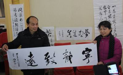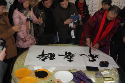 1月10日,安陆市文联、市书法家协会为该市巡店镇教师梁少金举办个人书法展暨《南镇风》文化沙龙活动。为打牢书法根基,培植基层新人,省书法协会领导亲临现场,挥毫泼墨,指导创作,为传承中华文化瑰宝加油打气。 (视界网 王代金 摄影)