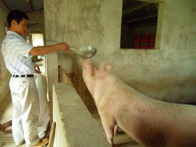7日,云梦道桥镇养猪户叶平元在给生猪喂食。两年前,33岁的叶平元利用在打工的积累回乡投资50余万元,开办了存栏352头的养猪场。由于受市场波动较大,效益一直不好。为了坚守这份事业,去年下半年,他改养优质二元杂交母猪50头,等待时机,再显身手。面对镇养猪协会工作人员,他呼吁,养猪协会要上报养猪困境,争取政府支援,并通过政府对肉联企业施加压力,让其合理提高收购价,以平衡社会利润分配。